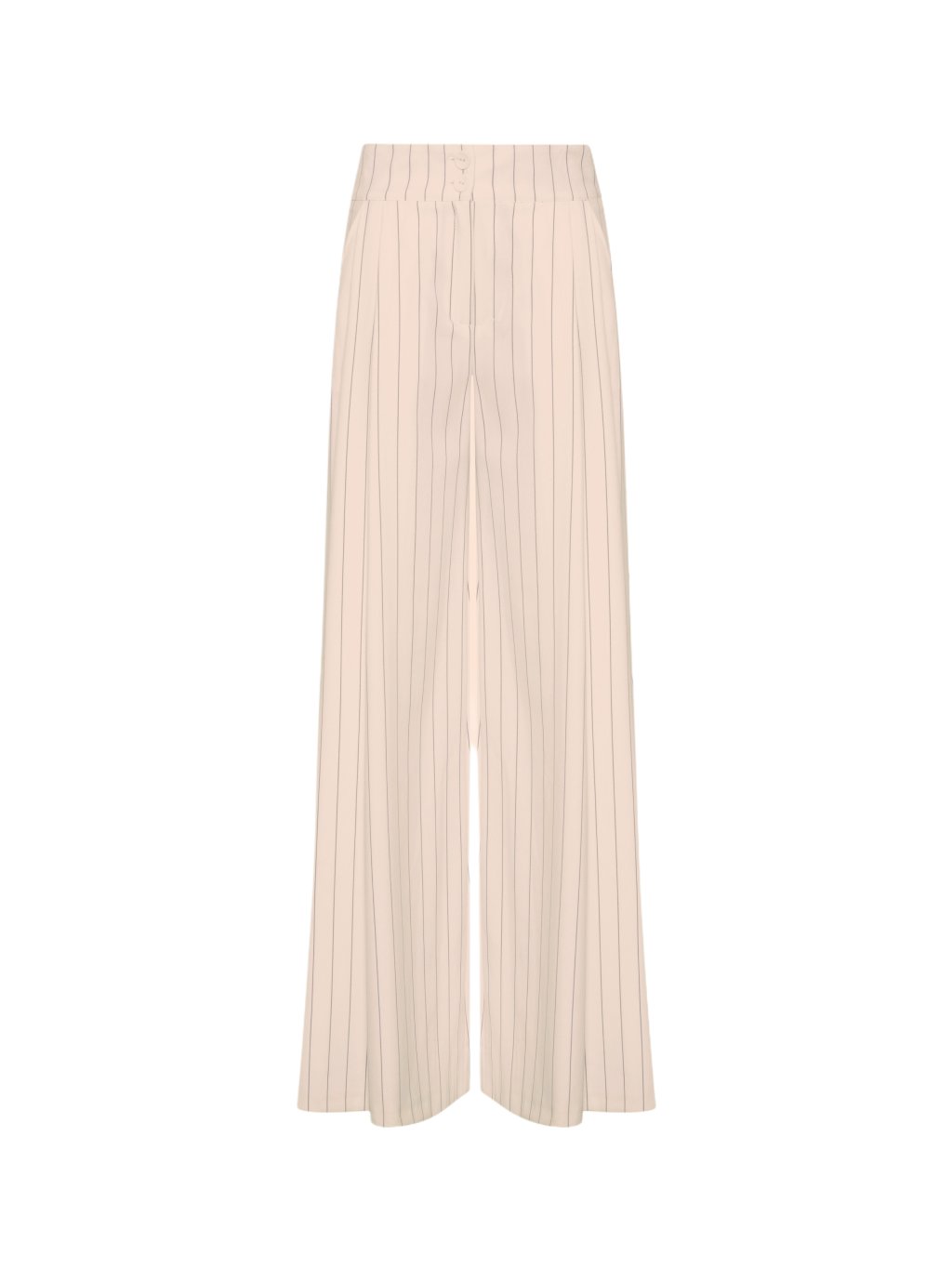 Široké béžové kalhoty s výraznými svislými pruhy mají extra široké nohavice, které vytvářejí krásně splývavý efekt při pohybu, a vysoký pas, který lichotí postavě. Díky lehkému, prodyšnému materiálu s příměsí elastanu jsou maximálně pohodlné a ideální pro teplé dny. Skvěle vyniknou v kombinaci s vestou ve stejném stylu, ale i samostatně s jednoduchým topem nebo košilí. Perfektní volba na dovolenou, letní večírek nebo elegantní městský look.