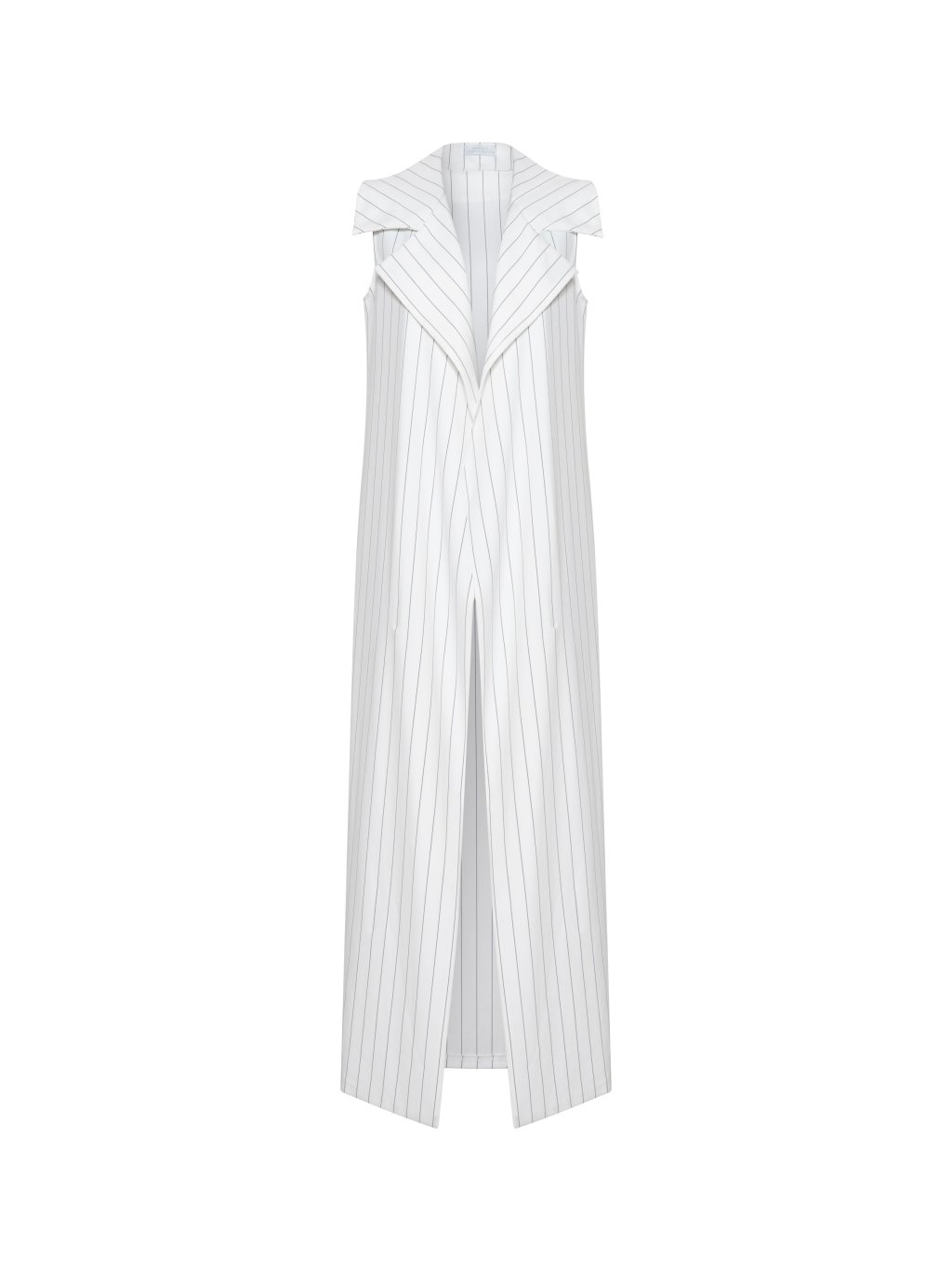 Bílé blejzrové šaty s širokým proužkem opticky prodlužují postavu a zvýrazňují ženskou siluetu. Široký klopový límec dodává šatům moderní šmrnc a přidaný pásek v pase umožňuje přizpůsobení střihu přesně na míru.