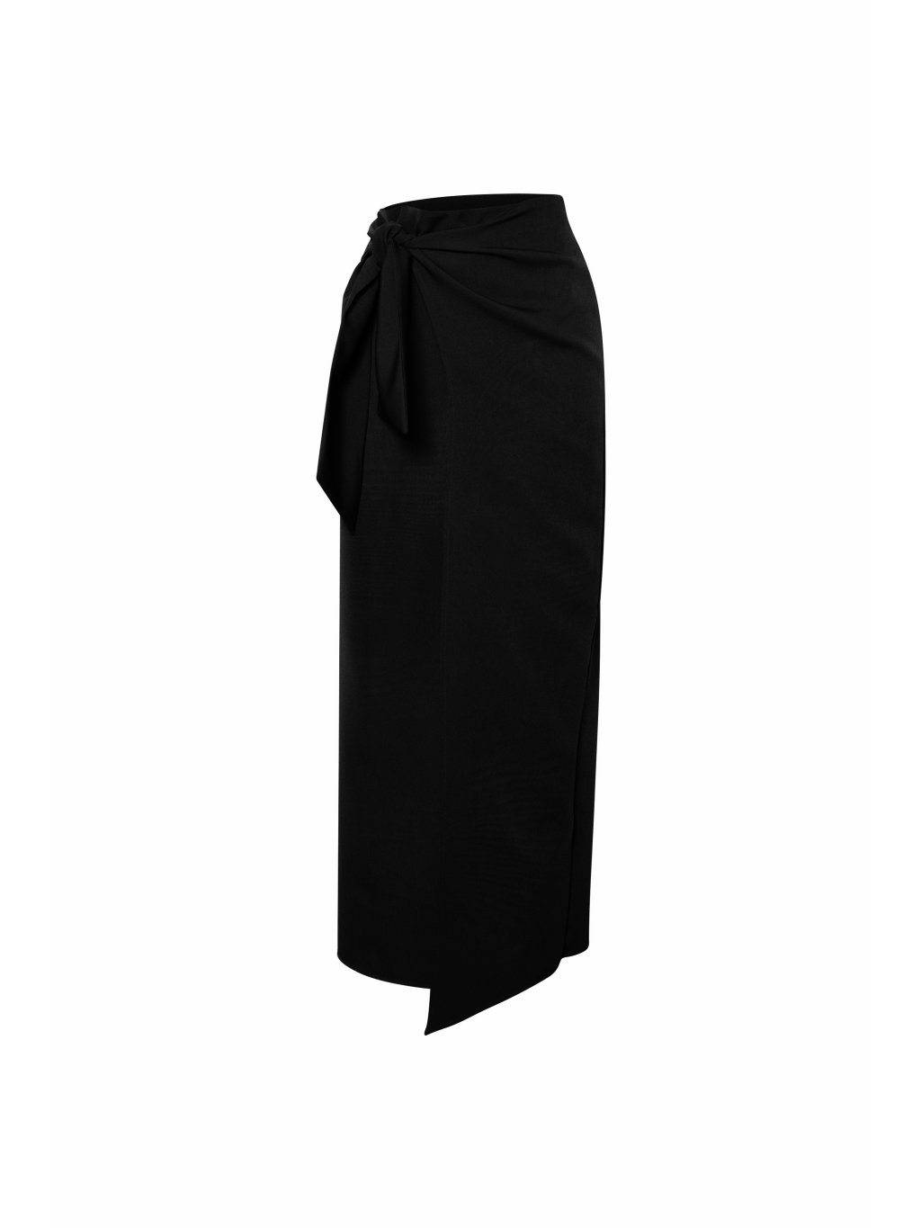 Klasická černá pouzdrová sukně nemusí být nudná. Prodloužený přidaný přední díl končí v "mašli" s velkým uzlem na pravém boku.