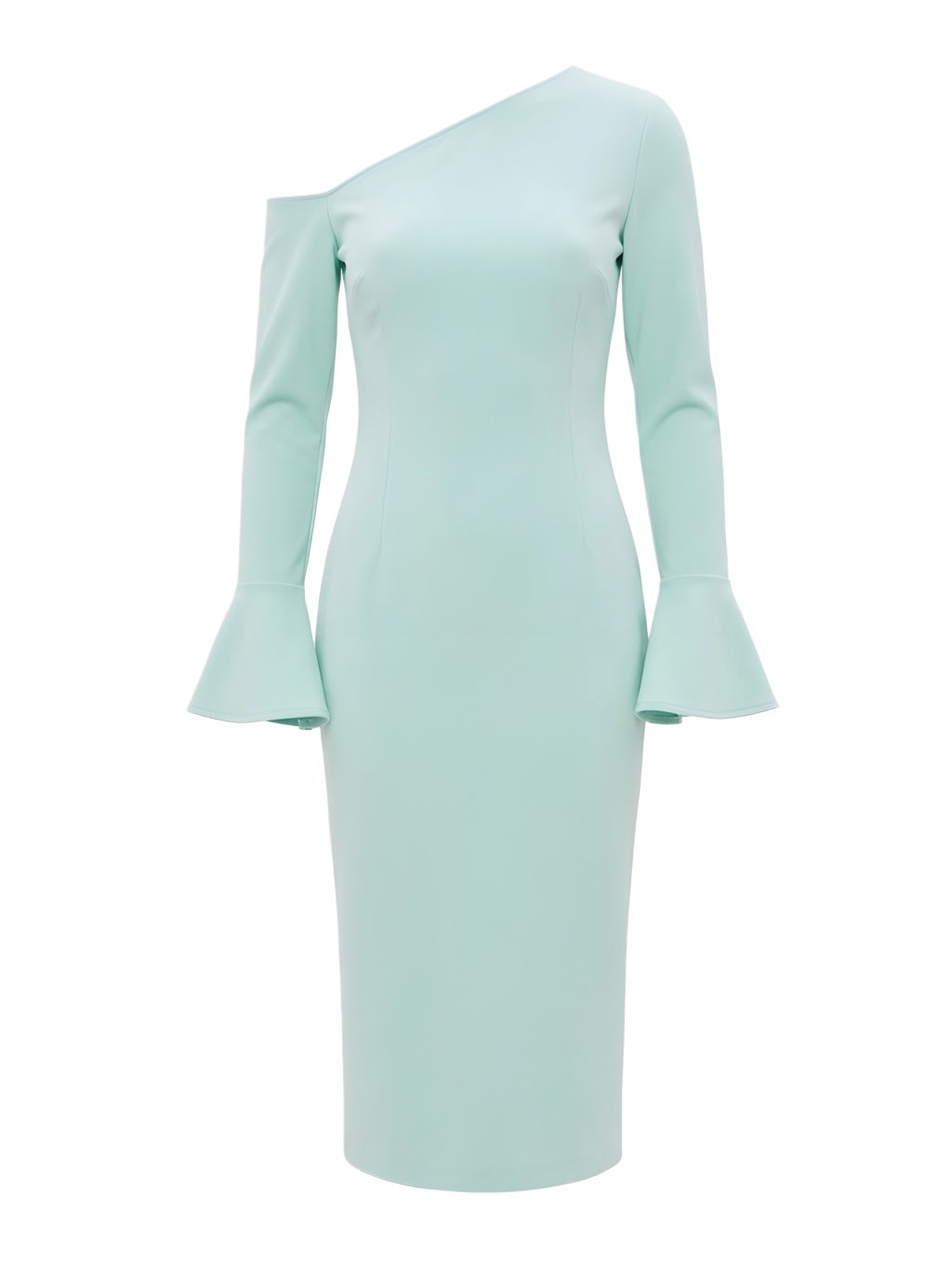 Dominantou těchto šatů je asymetrický výstřih, který nechává vyniknout linii ramen a klíčních kostí. Dlouhé, přiléhavé rukávy jsou zakončeny širokými zvonovými manžetami, které dodávají modelu dynamiku a moderní objem. Přiléhavý „bodycon“ střih kopíruje siluetu a díky preciznímu členění švů zajišťuje lichotivý vzhled. Šaty jsou ušity z pevnějšího, hladkého materiálu s příměsí elastanu, který drží tvar a zároveň se přizpůsobí pohybu. Délka sukně sahá pod kolena a je zakončena čistým lemem bez zbytečných přízdob.
