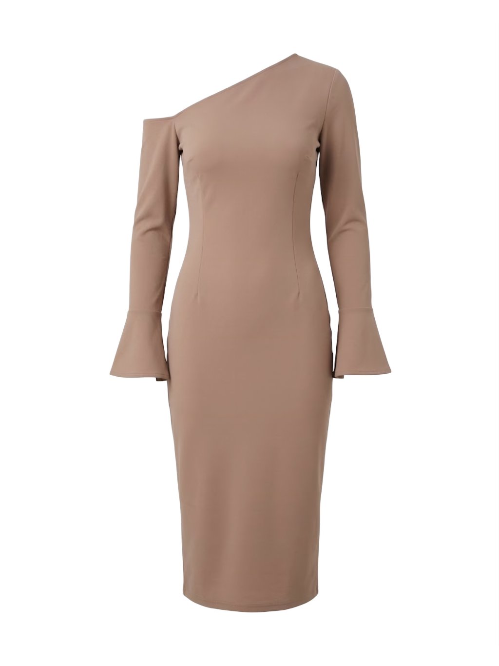Dominantou těchto šatů je asymetrický výstřih, který nechává vyniknout linii ramen a klíčních kostí. Dlouhé, přiléhavé rukávy jsou zakončeny širokými zvonovými manžetami, které dodávají modelu dynamiku a moderní objem. Přiléhavý „bodycon“ střih kopíruje siluetu a díky preciznímu členění švů zajišťuje lichotivý vzhled. Šaty jsou ušity z pevnějšího, hladkého materiálu s příměsí elastanu, který drží tvar a zároveň se přizpůsobí pohybu. Délka sukně sahá pod kolena a je zakončena čistým lemem bez zbytečných přízdob.