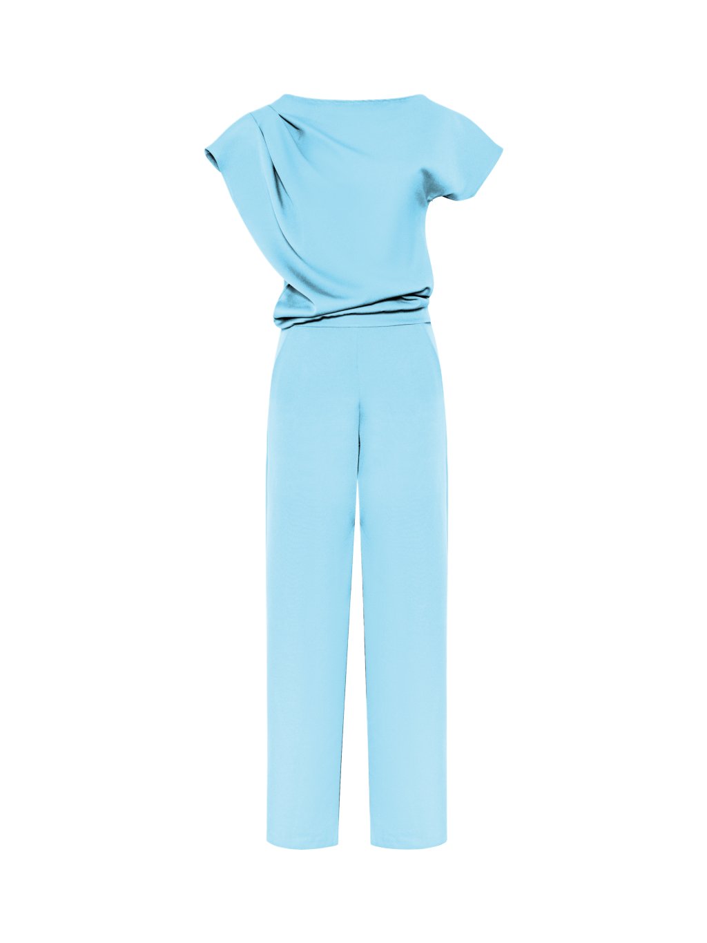 Vsaďte na jednoduchost s výrazem. Tento sofistikovaný overal v světle modré barvě je ztělesněním moderní elegance . Asymetrický výstřih odhalujícím jedno rameno a jemné skládání v horní části dodává outfitu strukturu a originalitu. Kalhotová část s volnějšími nohavicemi krásně prodlužuje postavu a poskytuje maximální pohodlí. Skrytý zip a praktické kapsy jen podtrhují nadčasový a funkční design.