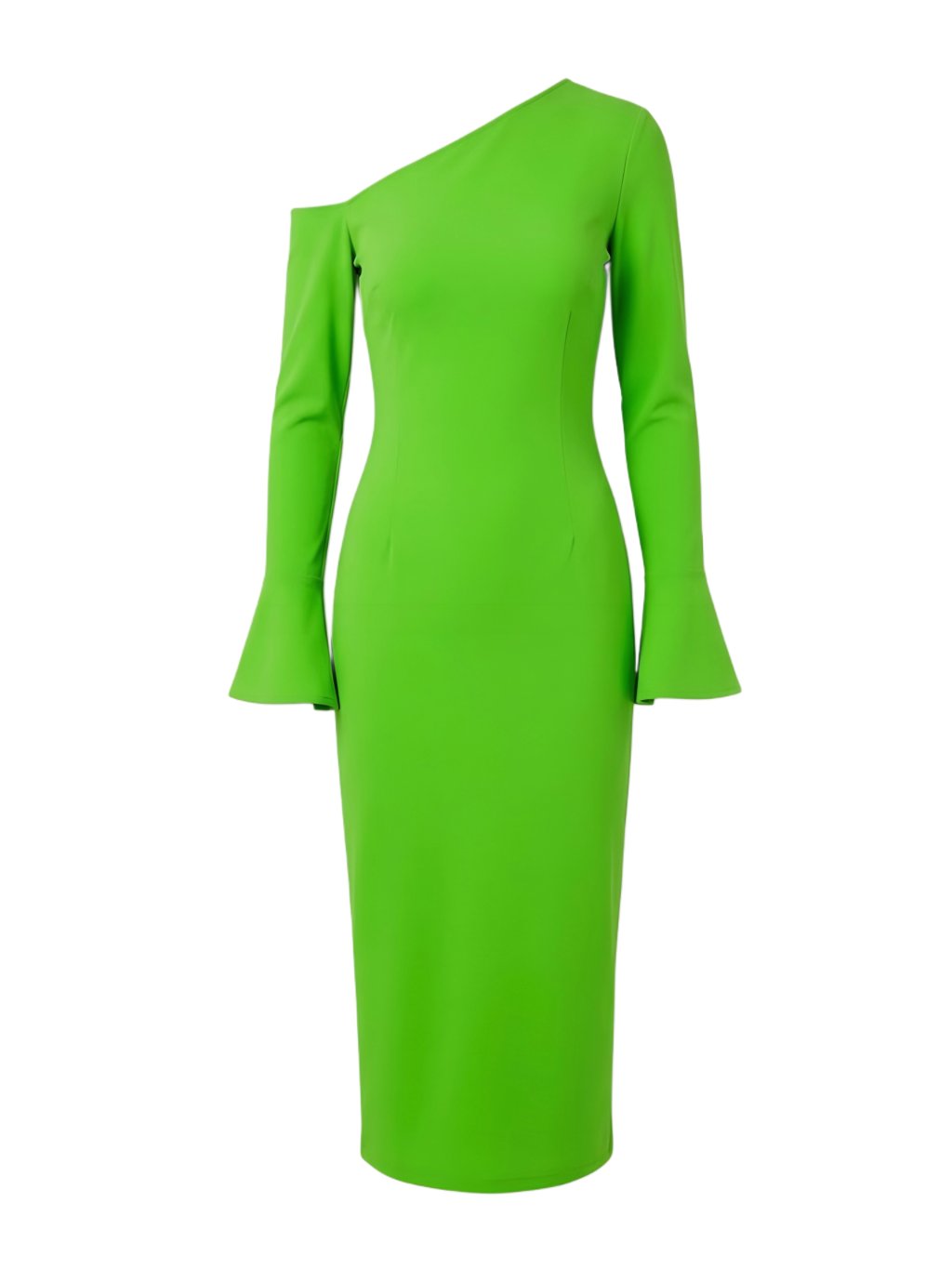 Dominantou těchto šatů je asymetrický výstřih, který nechává vyniknout linii ramen a klíčních kostí. Dlouhé, přiléhavé rukávy jsou zakončeny širokými zvonovými manžetami, které dodávají modelu dynamiku a moderní objem. Přiléhavý „bodycon“ střih kopíruje siluetu a díky preciznímu členění švů zajišťuje lichotivý vzhled. Šaty jsou ušity z pevnějšího, hladkého materiálu s příměsí elastanu, který drží tvar a zároveň se přizpůsobí pohybu. Délka sukně sahá pod kolena a je zakončena čistým lemem bez zbytečných přízdob.